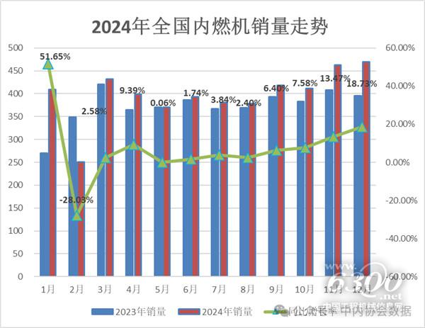 12月,內(nèi)燃機(jī)銷量469.94萬臺(tái),同比增長18.73%,市場整體表現(xiàn)較為平穩(wěn);