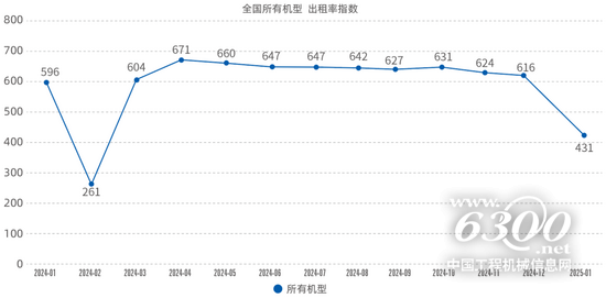 2025年1月升降工作平臺(tái)出租率指數(shù)為431點(diǎn),環(huán)比下降29.9%,同比下降27.7%。由于每年春節(jié)假期的影響及其時(shí)間的變化,1、2月份的出租率指數(shù)一直跳躍較大??傮w看1月份所有機(jī)型同比、環(huán)比出租率指數(shù)均處于下降狀態(tài),其中24m以下機(jī)型環(huán)比下降幅度最大,均超過30%,40m以上機(jī)型降幅最小為11.4%。2025年1月各機(jī)型出租率指數(shù)同比情況:12m以下剪叉車同比下滑超過30%,14~28m臂車同比降幅超過20%,而30m以上機(jī)型出租率同比降幅最小,均超過10%。(出租率是以臺(tái)天數(shù)為基準(zhǔn)進(jìn)行計(jì)算,100%出租率對(duì)應(yīng)1000點(diǎn)。)