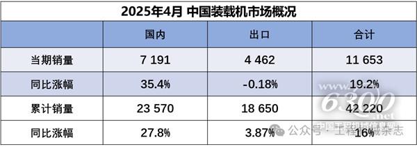 據(jù)中國工程機械工業(yè)協(xié)會對裝載機主要制造企業(yè)統(tǒng)計,2025年4月銷售各類裝載機11653臺,同比增長19.2%。其中國內(nèi)銷量7191臺,同比增長35.4%;出口量4462臺,同比下降0.18%。