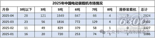 2025年4月銷售電動裝載機2924臺( 3噸以下28臺,3噸121臺,5噸1849臺,6噸847臺,7噸66臺,8噸以上4臺,滑移裝載機9臺)。