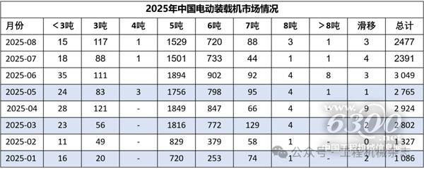 2025年8月銷(xiāo)售電動(dòng)裝載機(jī)2477臺(tái)( 3噸以下15臺(tái),3噸117臺(tái),4噸1臺(tái),5噸1529臺(tái),6噸720臺(tái),7噸88臺(tái),8噸3臺(tái),8噸以上1臺(tái),滑移裝載機(jī)3臺(tái))。