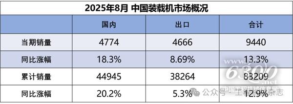 據(jù)中國(guó)工程機(jī)械工業(yè)協(xié)會(huì)對(duì)裝載機(jī)主要制造企業(yè)統(tǒng)計(jì),2025年8月銷(xiāo)售各類(lèi)裝載機(jī)9440臺(tái),同比增長(zhǎng)13.3%。其中國(guó)內(nèi)銷(xiāo)量4774臺(tái),同比增長(zhǎng)18.3%;出口量4666臺(tái),同比增長(zhǎng)8.69%。